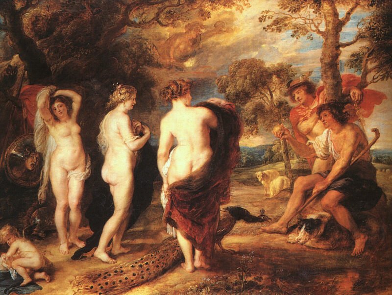 Tanto los dioses y diosas como diversos mortales fueron invitados a la boda de Peleo y Tetis (que luego serían padres de Akiles). Sólo la diosa Eris no fue invitada, pero apareció con una Manzana Dorada con la palabra kallistēi (‘para la más hermosa’) inscrita, que arrojó entre las diosas. Afrodita, Hera y Atenea (ellas son dos de las Diosas que jamás cedieron a los encantos de la Diosa Afrodita )reclamaron ser la más bella y por tanto la justa propietaria de la manzana. Estuvieron de acuerdo en llevar el asunto ante Zeus, quien, al no querer el favor de ninguna diosa, dejó la elección en manos de Paris de Troya. Hera intentó sobornarlo con un reino, mientras Atenea le ofreció sabiduría, fama y gloria en la batalla, pero Afrodita le susurró que si la declaraba la más bella le daría la mujer mortal más hermosa del mundo como esposa, por lo que Paris eligió a Afrodita. Esta mujer era Helena. Las otras diosas se enfurecieron y a través del rapto de Helena por Paris provocaron la Guerra de Troya.